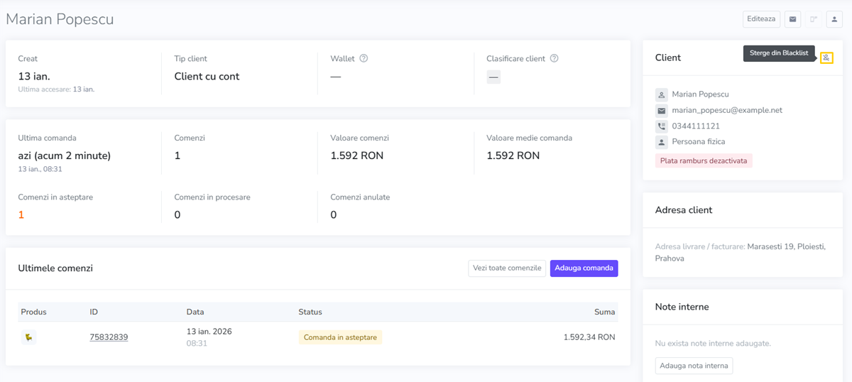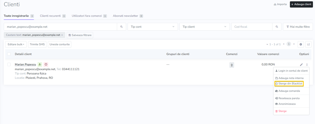 Ulterior, in shop va deveni disponibila la nivelul fiecarui client inregistrat optiunea de adaugare a acestuia in Blacklist.