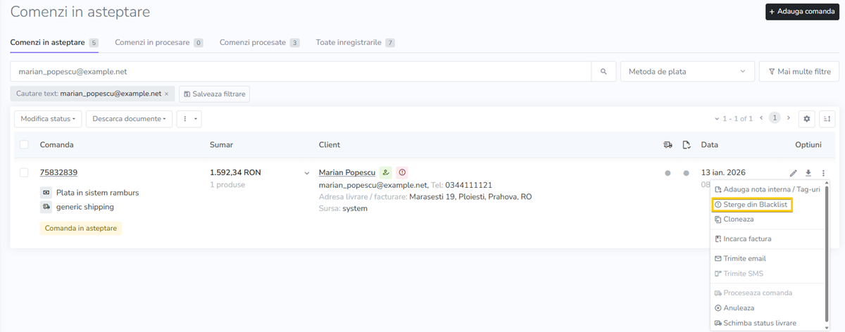 - Acceseaza meniul de optiuni asociat unei comenzi plasata de un client care figureaza ca Blacklisted;