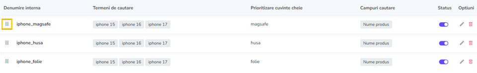 Prioritizarea rezultatelor afisate in cadrul magazinului tine cont de ordinea regulilor dinamice. Pentru a defini aceasta ordine, foloseste functia drag & drop disponibila in pagina Reguli ranking dinamic.