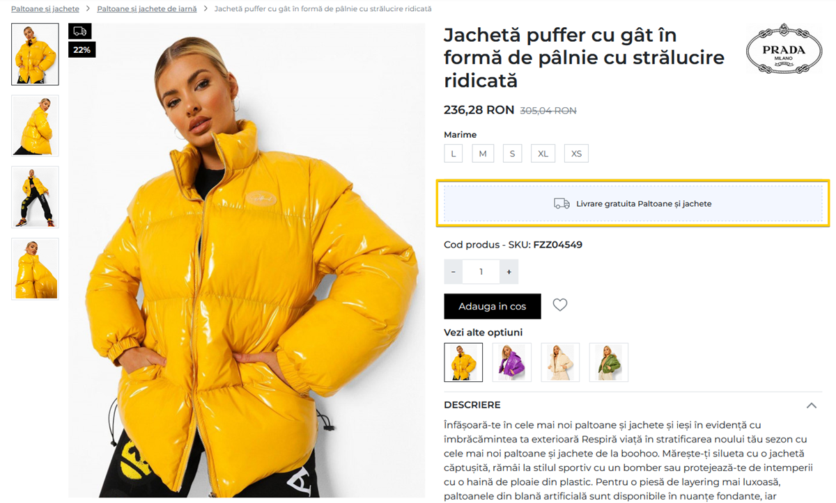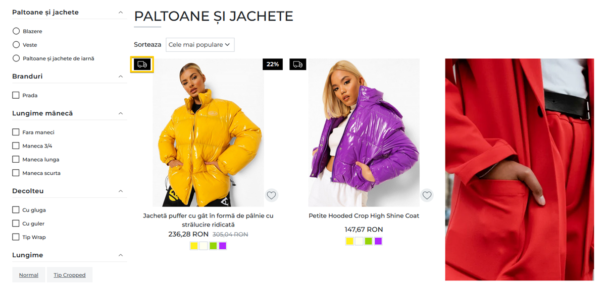 In cazul unei promotii de tip Cart, articolele incluse in promotiile de tip Livrare gratuita vor avea un marcaj specific atat in cadrul paginii de produs din magazin, cat si in listing-ul de produse al categoriilor din care fac parte.
