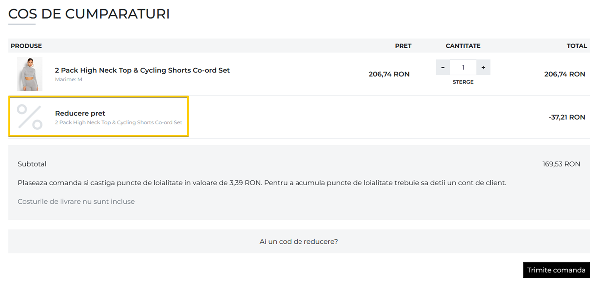Aditional, poti opta intre mai multe moduri de afisare a reducerilor de pret in cosul de cumparaturi, in pagina de checkout si ulterior pe facturi.