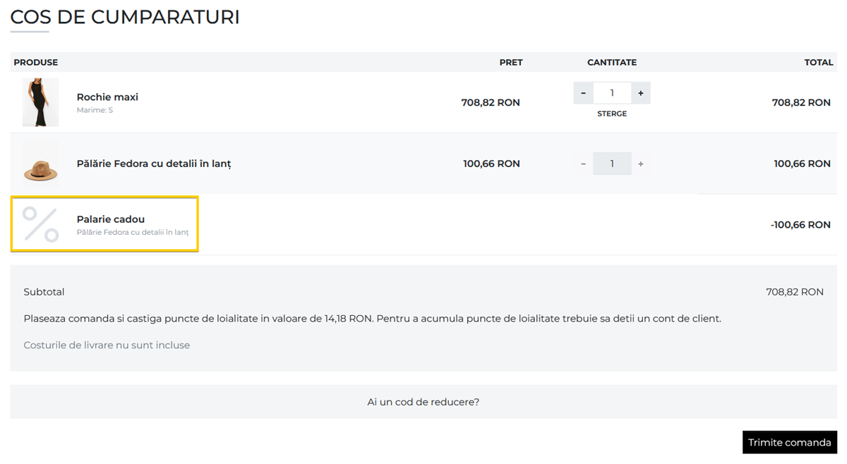 In schimb, promotiile de tip Bonus cashback, Produs cadou si Reducere pe comanda vor fi marcate doar la nivelul cosului de cumparaturi, conform setarilor pe care le definesti in Setari > Cos de cumparaturi.