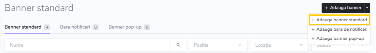 Acceseaza meniul asociat butonului Adauga banner si da click pe optiunea Adauga banner standard;