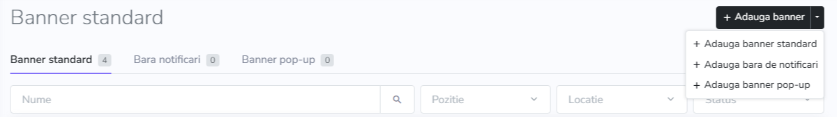 Pentru a adauga un banner, acceseaza Website > Bannere si apasa butonul Adauga banner, unde vei regasi urmatoarele optiuni: