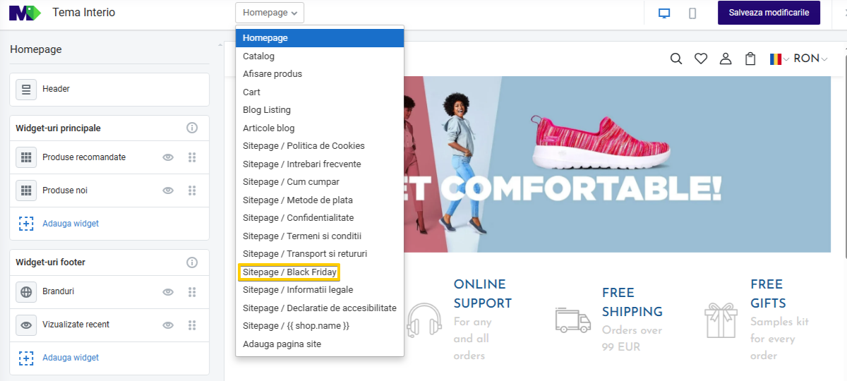 - Apasa butonul Editor pagini asociat temei curente a magazinului;