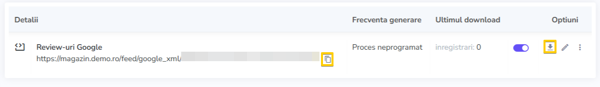 Dupa ce ai completat toate setarile si filtrele, salveaza feed-ul, apasa Salveaza, iar fisierul XML va fi generat in mod automat si il vei putea descarca accesand butonul Descarca din pagina Feed-uri review-uri sau poti copia URL-ul feed-ului.